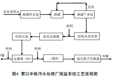 營口中板污水處理廠深度脫鹽系統處理量為1250m3/h,采用超濾和兩級反滲透的核心處理工藝(見圖4)。
