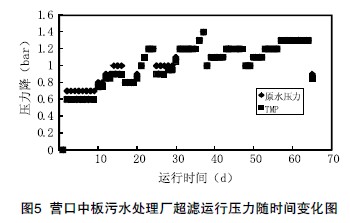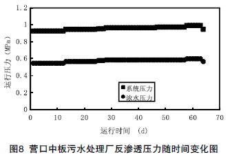 圖5是營口中板污水處理廠2007年7月至8月兩個月的運行數據記錄,對鋼鐵企業采用“雙膜法”深度脫鹽的污水回用有一定的參考意義。
