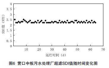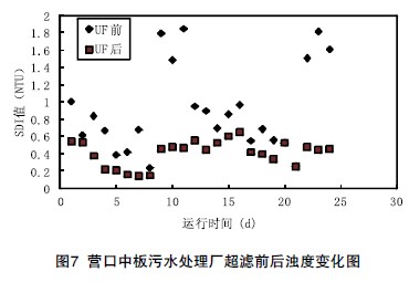 超濾的SDI值在整個運行期間,穩定在3以下。由圖7可見,濁度能穩定在1NTU以下。說明在類似的條件下,能穩定地保證反滲透的進水水質要求。