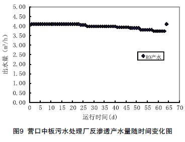 圖8、9是一級反滲透的運行數據,在為期2個月的運行中,在保證出水量恒定的情況下,反滲透的運行壓力由0.93MPa增加到1.0MPa,提高7%,經過化學清洗后能恢復到0.95MPa左右。反滲透的出水量由4.1m3/h降低到3.8m3/h,降低了7.3%。在進行化學清洗后可恢復到4.1m3/h,恢復性能良好。