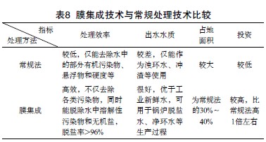 膜集成技術與常規處理回用技術在處理效率、出水水質、占地面積及投資方面的比較,見表8。