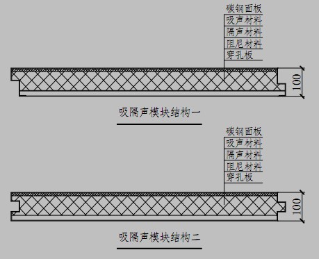 吸(xi)隔聲(sheng)模塊內(nei)(nei)部結構形(xing)(xing)式多樣,根據具體工程的實(shi)際情況,來確定吸(xi)隔聲(sheng)模塊的內(nei)(nei)部結構形(xing)(xing)式。圖1 所示的吸(xi)隔聲(sheng)模塊的內(nei)(nei)部結構為吸(xi)聲(sheng)材料(liao)、隔聲(sheng)材料(liao)、阻(zu)尼材料(liao),外為碳鋼面板(ban)(ban)和穿孔板(ban)(ban)。