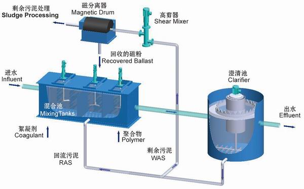 CoMag工(gong)藝優(you)化(hua)傳(chuan)統(tong)沉淀方(fang)式,采用增強型化(hua)學助凝劑、絮凝劑和加載高效可回收的(de)磁粉的(de)方(fang)式,提(ti)高沉降速(su)度、增加表面負荷、縮(suo)短水力停留時(shi)間,所(suo)以只(zhi)需很小的(de)占(zhan)地面積,也因(yin)此降低了設(she)置安裝費用。