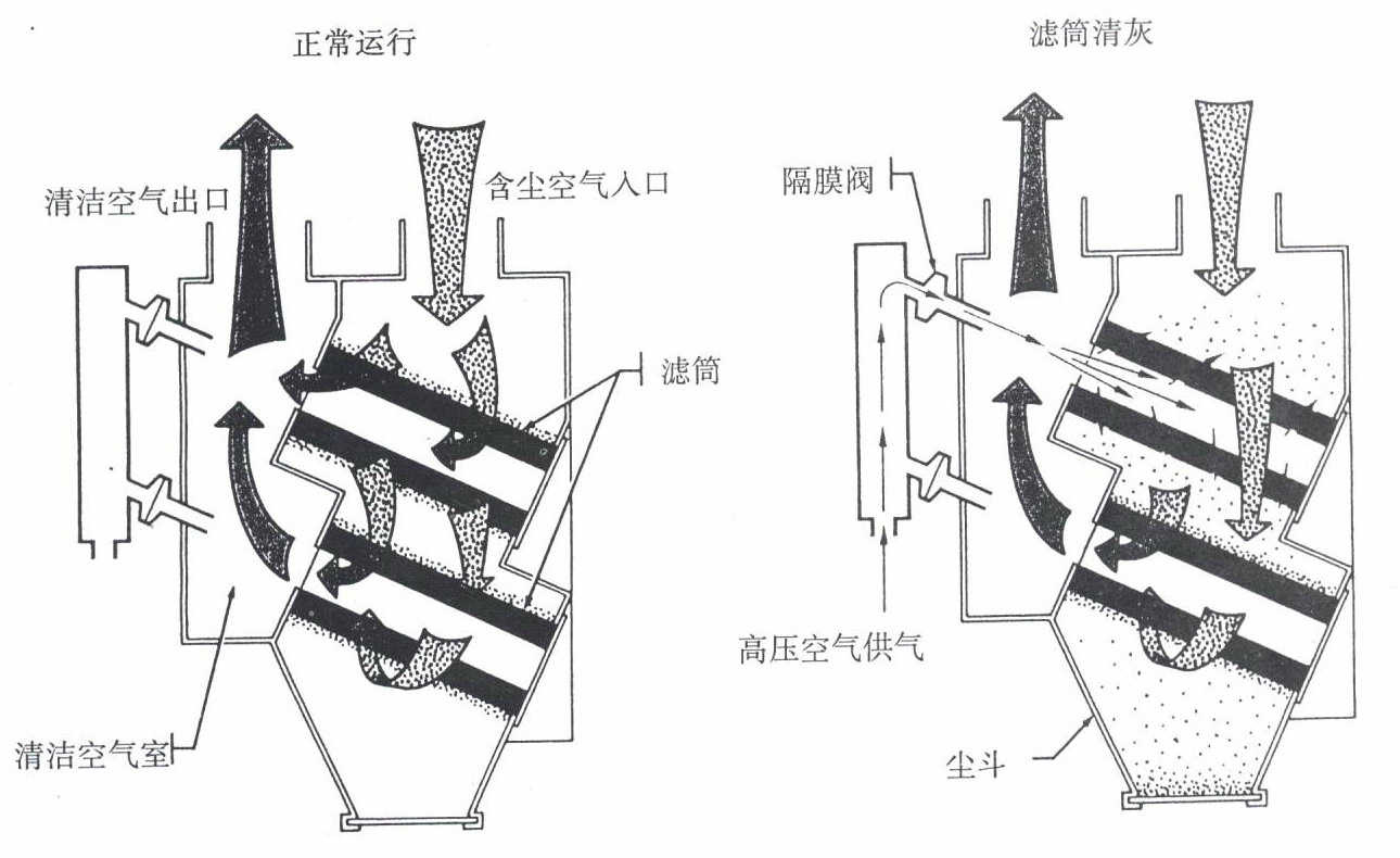 在正常運行時,含塵空氣由頂部入口進入除塵器,并通過過濾筒。于此,粉塵被捕集在過濾筒外表面,清潔空氣則經濾筒中心進入清潔空氣室,再經出口排出。 |