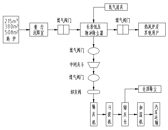 對高(gao)爐煤氣的(de)除(chu)塵(chen)(chen),自1987年(nian)開始在(zai)淮鋼55mз高(gao)爐和75mз高(gao)爐利(li)用(yong)長袋(dai)(dai)低(di)壓脈(mo)沖袋(dai)(dai)式除(chu)塵(chen)(chen)器的(de)工業性實(shi)驗(yan)后,成功的(de)解決(jue)了煤氣干(gan)潔凈化。利(li)用(yong)長袋(dai)(dai)低(di)壓脈(mo)沖袋(dai)(dai)式除(chu)塵(chen)(chen)器先后在(zai)成都鋼廠(chang)、漣(lian)源鋼廠(chang)、邯(han)鄲(dan)鋼廠(chang)、威遠鋼廠(chang)、沙鋼等單位(wei)的(de)109mз~380mз高(gao)爐上應用(yong),都收到了較好的(de)效果。20多年(nian)來高(gao)爐煤氣干(gan)法(fa)脈(mo)沖袋(dai)(dai)式除(chu)塵(chen)(chen)器已經成為(wei)(wei)中、小型高(gao)爐主要除(chu)塵(chen)(chen)方法(fa)。下圖為(wei)(wei)中型高(gao)爐煤氣凈化系(xi)統: