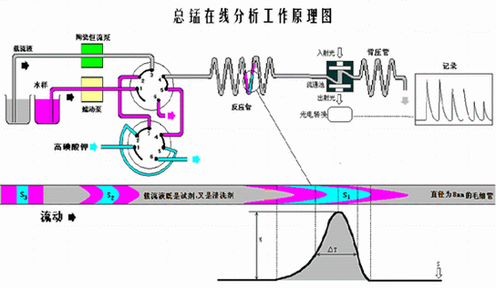 載流(liu)液(ye)經陶瓷泵輸送至反(fan)應(ying)(ying)(ying)管道中(zhong),當六通閥將(jiang)水(shui)樣和(he)(he)顯色(se)(se)劑(ji)(高碘酸鉀)切(qie)入(ru)反(fan)應(ying)(ying)(ying)管道中(zhong)后(hou),樣品(pin)和(he)(he)試劑(ji)被(bei)載流(liu)液(ye)推進并(bing)在推進過(guo)程中(zhong)漸(jian)漸(jian)擴(kuo)散,呈現梯(ti)(ti)度(du)混合,梯(ti)(ti)度(du)混合區(qu)帶快速發生顯色(se)(se)反(fan)應(ying)(ying)(ying),流(liu)過(guo)流(liu)通池,由光電比(bi)色(se)(se)計測量(liang)并(bing)記錄(lu)液(ye)流(liu)中(zhong)反(fan)應(ying)(ying)(ying)的(de)(de)紫紅色(se)(se)絡合物(wu)對525nm波長光吸(xi)收后(hou)透(tou)過(guo)光強(qiang)度(du)的(de)(de)變(bian)化值,獲(huo)得有相(xiang)應(ying)(ying)(ying)峰(feng)高和(he)(he)峰(feng)寬的(de)(de)響應(ying)(ying)(ying)曲線,用峰(feng)高或峰(feng)寬,經比(bi)較計算(suan)求得水(shui)樣中(zhong)總錳的(de)(de)值。儀器每天自動做一次標定。