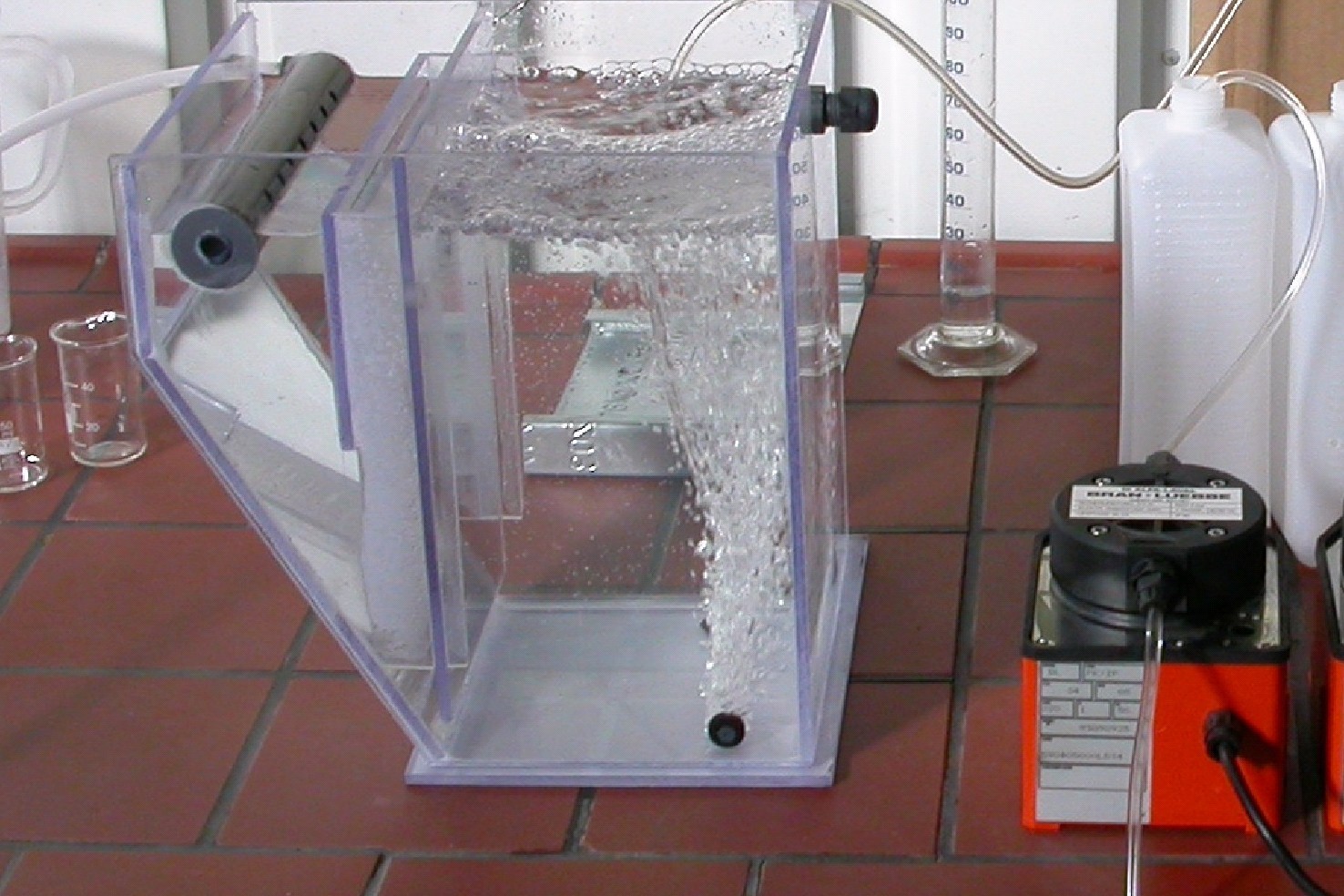 反應器容積(ji) V = 7 L,帶有曝氣裝置(zhi),二沉池容積(ji) V = 3.5 L with overflow. (圖4)。