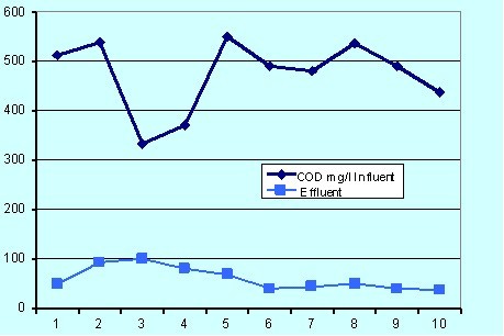 - 在水力停留時間為5.5 h以及負荷為 Lv = 2.48 gCOD/Lxd的條件下進水 COD為527 mg/L ,出水COD 為 28.2 mg/L , 去除率為94.7%。
