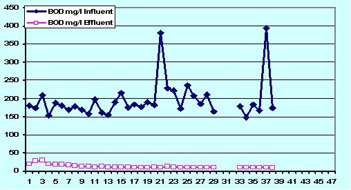 根據(ju)圖6中的(de)最后(hou)25天(tian)的(de)數(shu)據(ju),在(zai)水力停留(liu)時間5.5 h 和COD負荷Lv = 2.48 gCOD/Lxd的(de)條件下,進水的(de)平(ping)(ping)均(jun)COD為527mg/L, 經過LEVAPOR生物膜(mo)技術處理后(hou)出(chu)水的(de)COD均(jun)值(zhi)為28.2mg/L,平(ping)(ping)均(jun)去除率為94.7%。相應的(de)進水BOD5為198mg/L,出(chu)水BOD5的(de)均(jun)值(zhi)為10.9 mg/L,平(ping)(ping)均(jun)去除率為94.5%。