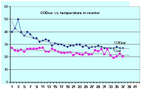 在(zai)開(kai)始階(jie)段出水(shui)(shui)COD達到100 mg/L,但是(shi)3天以后運行逐漸穩定,COD開(kai)始下降到40-50 mg/L ,隨著(zhu)反應過程(cheng)的逐步穩定處理效果也(ye)明(ming)顯增強(qiang) (圖 5)。水(shui)(shui)溫(wen)到了12月(yue)份也(ye)慢慢從 27-28°C 降低到20-21°C,但是(shi)去除效率(lv)依然(ran)保持在(zai)很穩定 的水(shui)(shui)平(ping)。