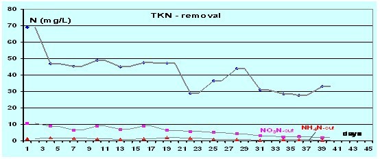 - 在同樣的條件下凱氏氮濃度能從41.1mg/L下降到7mg/L(1.1 mg/L NH4N 和 5.9 mg/L NO3N)