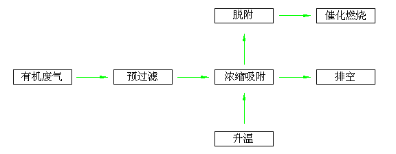 本凈化裝置是根據吸附(效率高)和催化燃燒(節能)兩個基本原理設計的。即吸附濃縮—催化燃燒法。該設備采用雙氣路連續工作,設兩個吸附床可交替使用,一個催化燃燒室,先將有機廢氣用活性炭吸附,當快達到飽和時停止吸附操作,然后用熱氣流將有機物從活性炭上脫附下來使活性炭再生;脫附下來的有機物已被濃縮(濃度較原來提高幾十倍)并送入催化燃燒室進行催化燃燒,在催化劑上于300~350℃進行催化氧化,使其轉化為無害的CO2和H2O排出,當有機廢氣濃度達到2000PPm以上時,有機廢氣在催化床可維持自然,不用外加熱,燃燒后的尾氣一部份排出大氣,大部份送往吸附床,用于活性炭的脫附再生。這樣能滿足燃燒和脫附所需熱能,達到節能的目的,再生后的活性炭可用于下次吸附;在其中一個吸附床進行脫附時控制系統可自動打開另一個吸附床繼續進行有機廢氣的吸附工作,如此以來兩臺吸附床切換運行可實現大工作量的連續工作。