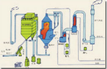 來自于酸(suan)(suan)洗線(xian)的廢酸(suan)(suan)用泵送(song)到過濾器中(zhong),過濾去掉固體(ti)顆粒(li)和(he)不溶物,在預濃縮器與熱焙(bei)燒氣體(ti)熱交換使部(bu)分液體(ti)蒸發形成濃縮廢酸(suan)(suan)。將濃縮廢酸(suan)(suan)用泵送(song)到焙(bei)燒爐,在高溫狀態下,使FeCl2分解為(wei)Fe2O3和(he)HCl。Fe203粉落(luo)入(ru)爐下錐體(ti),由收集輸送(song)系統收集。含有(you)HCL的熱焙(bei)燒氣體(ti)從爐頂部(bu)離開焙(bei)燒爐,通過旋風(feng)除塵器除去Fe203粉后進入(ru)預濃縮器,與循環廢酸(suan)(suan)接(jie)觸而被冷卻清洗,再(zai)進入(ru)吸收塔,HCl被吸收形成再(zai)生酸(suan)(suan)。