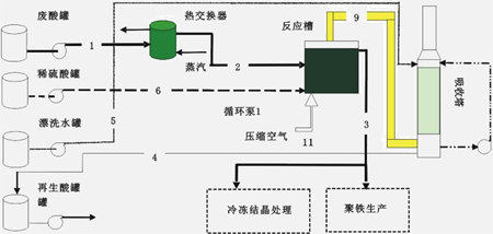 該技術(shu)采用加入(ru)硫(liu)(liu)酸(suan)(suan)置換反應(ying)原理,從帶鋼(gang)酸(suan)(suan)洗廢液中(zhong)回收鹽(yan)酸(suan)(suan)和高品質硫(liu)(liu)酸(suan)(suan)鐵或硫(liu)(liu)酸(suan)(suan)亞鐵。工藝過程包括:熱交換、置換反應(ying)、氯化氫(qing)洗滌(di)吸收等(deng)。
