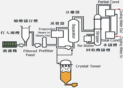 來自酸(suan)(suan)洗線的廢(fei)(fei)酸(suan)(suan)儲存于(yu)廢(fei)(fei)酸(suan)(suan)儲罐(guan),經(jing)泵提升經(jing)廢(fei)(fei)酸(suan)(suan)過(guo)濾器(qi)泵入回收系統(tong)的熱(re)交換(huan)區間。廢(fei)(fei)酸(suan)(suan)經(jing)過(guo)蒸汽(qi)換(huan)熱(re)器(qi)進行熱(re)交換(huan)后進入蒸發分離(li)器(qi),廢(fei)(fei)酸(suan)(suan)和(he)(he)水(shui)在此不斷的蒸發,直到(dao)溫度(du)達到(dao)飽(bao)和(he)(he)點(dian)為止。通過(guo)調(diao)整廢(fei)(fei)酸(suan)(suan)進入系統(tong)的速度(du)和(he)(he)過(guo)飽(bao)和(he)(he)酸(suan)(suan)及水(shui)蒸汽(qi)離(li)開(kai)蒸發回路的速度(du),系統(tong)即(ji)可循環運(yun)轉。