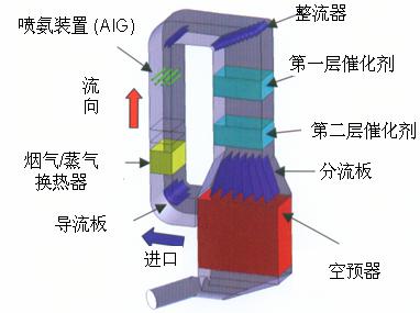 SCR過程通常采用在空氣預熱器上游含NOX的煙氣中注入氨作還原劑對NOX進行還原。此處煙氣溫度約290~400℃,是還原反應的最佳溫度。在含有催化劑的反應器內NOX被還原為N2和水,SCR催化劑一般用使用TiO2作為載體的 V2O5/WO3及MoO3等金屬氧化物,如下所示,NOX被選擇性的還原: