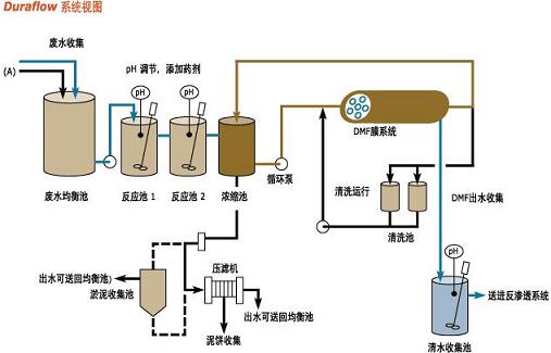 DF膜系統(DMF)是以固液分離來過濾經過化學預處理之后的廢水,對于含有重金屬的廢水的處理效果尤為理想。