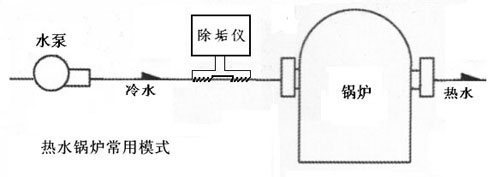將(jiang)Decent_tech 非(fei)接觸電(dian)子感應水處理系統(tong)安裝在鍋爐(lu)進(jin)水管道處。鍋爐(lu)應用模式示意圖(tu)如下: