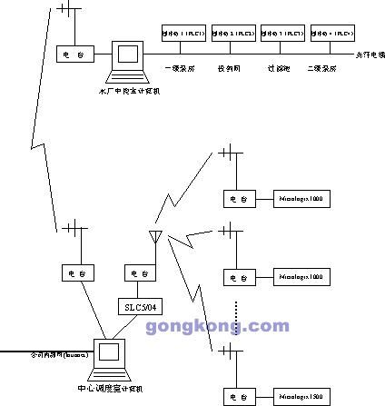 中心調度室設在自來水公司辦公大樓頂層,中心調度室與水廠采用點對點通訊,中心調度室與輸水管網測點采用點對多點通訊。無線通訊采用具有SCADA功能的DF1主從通訊協議,PLC通過其標準RS232接口與數傳電臺相連實現無線通訊,通訊速率可達9600bps。鑒于控制的統一性和可靠性,中心調度室對水廠自控系統只實行實時監視,不進行控制。水廠所有生產設備都實行三級控制,即本地控制、PLC自動控制和水廠中控室操作員控制。