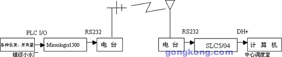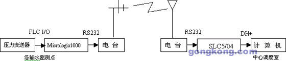 在SCADA系統中,用于輸水管線參數監測的PLC采用最為經濟可靠的微型可編程控制器MicroLogix1000作為系統端機(RTU),各輸水監測點作為SCADA系統的DF1從站。用于鎮級小水廠參數監測的PLC采用可擴充I/O口的微型可編程控制器MicroLogix1500作為系統端機(RTU),同樣各鎮級小水廠作為SCADA系統的DF1從站。各輸水監測點、鎮級小水廠與中心調度室數據傳輸如圖三、圖四所示。
