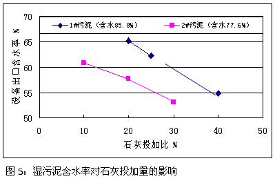 在脫水污泥不需要進一步處理時,人們常常忽視機械脫水率。其實無論采用任何工藝處理脫水污泥(如焚燒、干化、堆肥、石灰處理),濕污泥的含水率都嚴重影響處理效果及處理費用。圖5為不同濕污泥含水率對石灰投加量以及處理后物料含水率的影響。可見達到相同物料的含水率,濕污泥含水率的增加可導致石灰投加量的顯著增加。