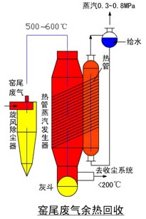 從干法中空回轉窯尾排出的廢氣經過旋風除塵后進入熱管蒸汽發生器,廢氣溫度從600℃左右降至200℃以下,入布袋收塵系統,經引風機排入煙囪。其優點是: