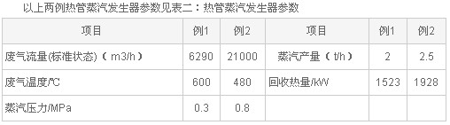 例二:某廠生產白水泥,鍛燒窯規格為φ1.9/1.6m×39m,每小時生產熟料量2噸,窯尾廢氣溫度600℃,經過熱管蒸汽發生器降到200℃以下去布袋除塵器,回收的熱量產生0.3MPa蒸汽供生活用,總工程投資一年內可回收。
