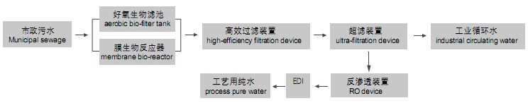 該工藝可(ke)有效去(qu)除(chu)市政污水(shui)(shui)中(zhong)的懸浮(fu)物、COD、膠體(ti)、有機(ji)物等,可(ke)完全滿足(zu)工業循(xun)環水(shui)(shui)的使(shi)用要求,如果再經反滲透脫鹽(yan)及EDI精除(chu)鹽(yan),可(ke)達到中(zhong)高(gao)壓(ya)鍋爐補(bu)給水(shui)(shui)甚至更高(gao)的水(shui)(shui)質要求。