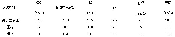 處理工藝為物理—化學方法,鱗化廢水經破乳后,投加藥劑不使絮狀物下沉,而且去除了石油類和磷、鋅等污染物,降低了COD。最后采用高效固液分離器,進一步凈化水質。高濃度磷化原液和脫脂原液則經過預處理后定量進入主流程。出水經調節pH后達標排放。