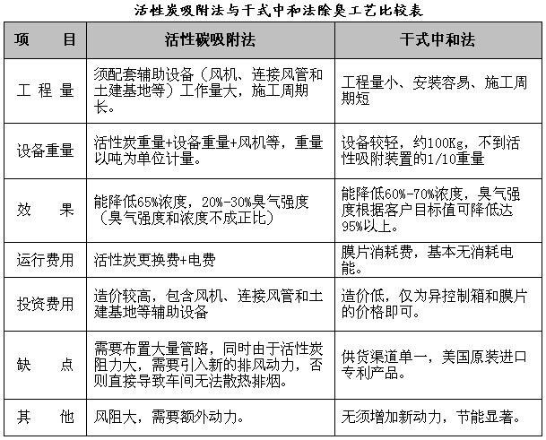 早期橡膠輪胎制造行業生產廢氣主要選用活性碳吸附工藝。隨著干式中和法的出現,很好的解決了輪胎工藝廢氣除臭的難。下面就活性炭吸附工藝與干式中和工藝進行比較: