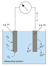 S-12/S-14溶解氧探頭采用開放式電極,其工作原理是電流法原理。兩種不同金屬材質的電極在沒有膜保護的情況下,直接浸沒到測量溶液中(見圖2)。探頭的陰極是由特殊材質的銀合金制成,陽極由鐵或鋅制成,取決于具體的應用場合。這兩個電極根據Toedt原理形成了電池,在電池中產生退極化電流,退極化電流是由下列化學反應產生的: