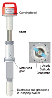 (2)曝氣池內活性污泥含量高(4-7g/L),傳統的膜法探頭很容易就被污泥封堵。而S-12/S-14探頭的頂部裝有磨石,磨石通過每分鐘只有幾轉轉速的同步電機進行連續旋轉來打磨陽極和陰極表面。這種磨石機械自清洗過程不但能夠對電極進行輕微的拋光,并且可以將電極上的沉淀物有效去除,既保證了連續檢測數據的準確,又方便使用減少電極清理周期。