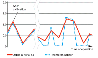因此,電極的測量表面需要持續進行清洗。德國的醫學家Gerhard Stracke博士設計了第一臺帶有自清洗系統的溶解氧探頭,他也在1958年獲得了ATV獎。在瑞士蘇黎世的聯邦技術研究院,研發出一臺新的自清洗裝置。在1968年,Zullig AG獲得了專利,并開始進一步研發和生產堅固耐用的在線傳感器。探頭的工作方式如下:在探頭的頂部裝有磨石,用于打磨陽極和陰極表面。經過多年的優化實驗,現在的磨石是由含有少量金剛石的合成樹脂制成。磨石可以通過每分鐘只有幾轉轉速的同步電機進行連續旋轉。電極通過這種機械自清洗進行了輕微的拋光,并且可以將電極上的沉淀物有效去除。這種自清洗裝置的好處可以通過比對膜式傳感器和Hach-Zullig公司的S-12溶解氧探頭在曝氣池運行過程中測得的溶解氧值看出來。與具有自清洗系統的探頭相比,膜式傳感器由于膜上的沉積物而導致零點漂移過高(見圖3)。結果,覆膜的傳感器就會過早的顯示零點。因此會導致曝氣裝置過早的開啟,引起運行成本過高。