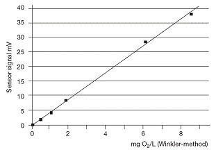Hach-Zullig公司的S-12/S-14溶解氧探頭沒有極化電壓,傳感器的信號和溶解氧的濃度之間呈線性關系(見圖4)[6], [7]。因此,單點校準就已經足夠。但是,膜式傳感器通常要在空氣中進行校準,使用具有開放式電極的傳感器就不太可能了,因為陽極和陰極之間的電流環路在空氣中沒有閉合。但是,這并不是什么壞處,因為這種類型的傳感器需要重新進行校準的頻率要比膜式傳感器低。校準必須要在水中的溶解氧濃度較高的情況下完成。出于這個目的,準備飽和溶解氧溶液并采用飽和表格來確定其校準曲線是比較合適的方法。