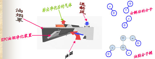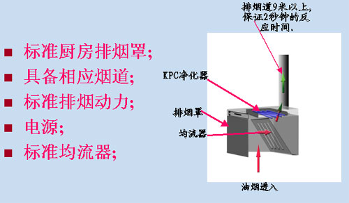 KPC油煙凈化裝置:是利用紫外線-C波段的光來改變油質的分子鏈,同時這種紫外線與空氣中的氧反應后產生臭氧,臭氧將油質分子冷燃燒后生成水和二氧化碳,同時煙道中的異味也隨之消除。