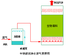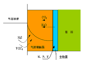 在適宜的環境條件下,附著于生物填料上的微生物利用廢氣中的污染物作為能源,維持生命活動,并將其分解為 CO 2 、 H 2 O 和其他無機鹽類,從而使廢氣得以凈化。