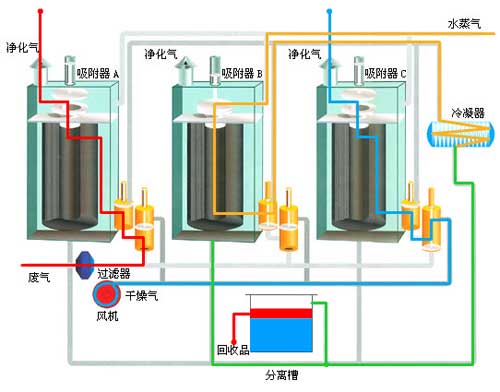 整個工藝流程如圖所示,三個吸附器共用一個管路系統,運行時相互切換。當A吸附器吸附時,B吸附器解吸,C吸附器再生。當有機廢氣進入吸附器,其中的有機物穿過活性炭纖維氈后被吸附下來,凈化后的氣體由吸附器頂部排出。A、B、C三個吸附器交替切換。 系統采用水蒸汽為脫附劑,脫附蒸汽由吸附器頂部進入,穿過活性炭纖維氈,將被吸附濃縮的有機物脫附出來并帶入冷凝器,經過冷凝,有機物和水蒸汽的混合物被冷凝下來流入分層槽,通過重力沉降分離,達到回收有機物的目的。分離后的水排放至廠方化學污水系統集中處理后排放。系統運行過程中所有的動作切換,均由自動控制系統完成。