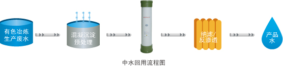 運用生產廢水混凝沉淀-預處理系統-超濾膜系統-納濾系統的主要工藝,對有色冶煉生產廢水雙膜法深度處理生產回用,實現有色冶煉生產廢水閉路循環零排放,處理水量:19200噸/天。