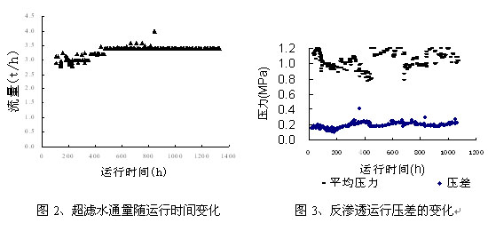 圖2為超(chao)濾(lv)(lv)水(shui)(shui)通量隨運行時間變(bian)化,可以看出(chu):超(chao)濾(lv)(lv)通過每隔30分鐘定期氣水(shui)(shui)反(fan)(fan)洗,保持了平穩的(de)流量。在(zai)跨膜壓差(cha)達到0.2MPa時,仍能保持21L/m2•h,通量基本維持在(zai)25-26 L/m2•h。超(chao)濾(lv)(lv)產水(shui)(shui)濁度低于(yu)0.2NTU以下。水(shui)(shui)回收率達到95%以上,5%的(de)水(shui)(shui)主要(yao)用于(yu)反(fan)(fan)洗及化學清洗等用途。