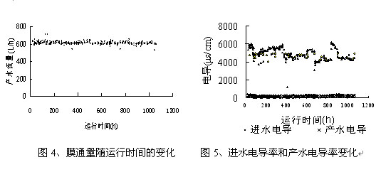 圖4看到(dao)(dao)在運行期間反滲(shen)(shen)透(tou)膜(mo)平均(jun)通量達(da)到(dao)(dao)24.79L/m2•h,最高可(ke)達(da)到(dao)(dao)28.6 L/m2•h,并且流量比較(jiao)平穩(wen),沒(mei)有比較(jiao)大的衰減。由圖5可(ke)以(yi)看出,反滲(shen)(shen)透(tou)產水(shui)(shui)電(dian)導率在150μs/cm,達(da)到(dao)(dao)了用戶自來水(shui)(shui)的標準;平均(jun)脫鹽率達(da)到(dao)(dao)了97%;反滲(shen)(shen)透(tou)水(shui)(shui)回(hui)收率達(da)到(dao)(dao)了75%。采(cai)用超濾膜(mo)和反滲(shen)(shen)透(tou)膜(mo)處理放流水(shui)(shui)試(shi)驗,結果(guo)表明經過(guo)處理的放流水(shui)(shui)再經膜(mo)法處理運行相(xiang)當(dang)穩(wen)定,反滲(shen)(shen)透(tou)透(tou)過(guo)液(ye)比工業給(gei)水(shui)(shui)清澈,含鹽量也(ye)低,并可(ke)以(yi)回(hui)用于紙機各條(tiao)生產線中。