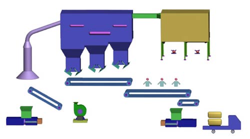 本套系統由立式曲折風選機、氣固分離沉降室、皮帶輸送機、引風機、打包機、空氣壓縮機、油水分離器、干燥機、儲氣緩沖罐、輸送管路、電氣控制及鋼支撐架等組成。