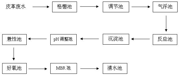 我(wo)公司(si)(si)承接的興昂制革(惠州)有限公司(si)(si)的皮革廢水治(zhi)理及回用(yong)(yong)工(gong)程設計處理能力為2400m3/d,采用(yong)(yong)A/O生化+MBR膜+深度處理的組合工(gong)藝(yi),其(qi)廢水經(jing)過處理后回用(yong)(yong)1600m3/d至生產線,廢水回用(yong)(yong)率達到67%。該(gai)工(gong)藝(yi)流程為: