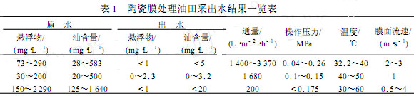 Simms等(deng)人采(cai)用(yong)了(le)高分子膜(mo)(mo)(mo)和MembraloxÒ陶(tao)(tao)瓷(ci)(ci)膜(mo)(mo)(mo)對(dui)(dui)加拿大(da)(da)(da)西(xi)部的(de)(de)重(zhong)油(you)(you)采(cai)出(chu)(chu)(chu)水(shui)(shui)(shui)進(jin)(jin)行(xing)了(le)處(chu)理,其通(tong)量相對(dui)(dui)較小(xiao)。表1是(shi)以(yi)(yi)上(shang)研(yan)(yan)究(jiu)(jiu)工(gong)(gong)(gong)(gong)作主要(yao)結果,從中可(ke)以(yi)(yi)看出(chu)(chu)(chu),采(cai)用(yong)陶(tao)(tao)瓷(ci)(ci)膜(mo)(mo)(mo)處(chu)理油(you)(you)田(tian)采(cai)出(chu)(chu)(chu)水(shui)(shui)(shui)是(shi)可(ke)行(xing)的(de)(de),出(chu)(chu)(chu)水(shui)(shui)(shui)水(shui)(shui)(shui)質均能滿(man)足回(hui)注水(shui)(shui)(shui)的(de)(de)要(yao)求(qiu)。國外對(dui)(dui)這一研(yan)(yan)究(jiu)(jiu)工(gong)(gong)(gong)(gong)作已進(jin)(jin)行(xing)了(le)10年,國內也開展(zhan)了(le)3年的(de)(de)研(yan)(yan)究(jiu)(jiu),目前(qian)(qian)尚處(chu)于工(gong)(gong)(gong)(gong)業性試(shi)驗階段,難以(yi)(yi)大(da)(da)(da)規模工(gong)(gong)(gong)(gong)業應用(yong)的(de)(de)原因(yin)在于:其一是(shi)成(cheng)本(ben)問(wen)題,必(bi)須降低(di)裝置的(de)(de)一次性投資,并通(tong)過工(gong)(gong)(gong)(gong)藝條件的(de)(de)優化設計(ji),強化傳(chuan)質過程,降低(di)操作成(cheng)本(ben);其二是(shi)膜(mo)(mo)(mo)的(de)(de)清(qing)(qing)洗(xi)再生方法,由于各油(you)(you)田(tian)的(de)(de)水(shui)(shui)(shui)質情況差(cha)別很大(da)(da)(da),必(bi)須針對(dui)(dui)具(ju)體對(dui)(dui)象(xiang)開發合(he)適的(de)(de)清(qing)(qing)洗(xi)方法;其三是(shi)如何能夠長時間維持膜(mo)(mo)(mo)通(tong)量的(de)(de)穩定(ding)性,減少清(qing)(qing)洗(xi)次數。根據目前(qian)(qian)陶(tao)(tao)瓷(ci)(ci)膜(mo)(mo)(mo)的(de)(de)發展(zhan)趨勢和研(yan)(yan)究(jiu)(jiu)工(gong)(gong)(gong)(gong)作進(jin)(jin)展(zhan),采(cai)用(yong)陶(tao)(tao)瓷(ci)(ci)膜(mo)(mo)(mo)處(chu)理油(you)(you)田(tian)采(cai)出(chu)(chu)(chu)水(shui)(shui)(shui)的(de)(de)工(gong)(gong)(gong)(gong)業應用(yong)是(shi)可(ke)能的(de)(de),但(dan)必(bi)須進(jin)(jin)行(xing)大(da)(da)(da)量的(de)(de)基礎和工(gong)(gong)(gong)(gong)程研(yan)(yan)究(jiu)(jiu)工(gong)(gong)(gong)(gong)作。