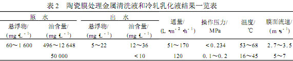 Chen等(deng)人(ren)經過(guo)(guo)(guo)比(bi)(bi)較(jiao)采(cai)(cai)用(yong)孔徑(jing)為0.05μm的(de)(de)(de)氧(yang)化(hua)(hua)(hua)鋯(gao)膜處(chu)理金屬清(qing)洗液(ye)(ye),通過(guo)(guo)(guo)過(guo)(guo)(guo)濾(lv)除去廢水(shui)(shui)中的(de)(de)(de)油和雜質(zhi),濾(lv)過(guo)(guo)(guo)水(shui)(shui)補充適當的(de)(de)(de)表(biao)面活性(xing)劑即可重新使用(yong),其結果(guo)見(jian)表(biao)2。冷(leng)(leng)軋乳(ru)化(hua)(hua)(hua)液(ye)(ye)是(shi)軋鋼(gang)行(xing)業產生的(de)(de)(de)一種(zhong)廢水(shui)(shui),水(shui)(shui)中主(zhu)要含有(you)1%~3%的(de)(de)(de)礦物(wu)油、乳(ru)化(hua)(hua)(hua)劑,與金屬清(qing)洗液(ye)(ye)比(bi)(bi)較(jiao)類似,常(chang)規的(de)(de)(de)方法處(chu)理效果(guo)不(bu)好,且處(chu)理費用(yong)高,目前冷(leng)(leng)軋乳(ru)化(hua)(hua)(hua)液(ye)(ye)處(chu)理是(shi)困擾我國(guo)軋鋼(gang)行(xing)業的(de)(de)(de)一大技術(shu)難(nan)題。張國(guo)勝采(cai)(cai)用(yong)0.2μm的(de)(de)(de)氧(yang)化(hua)(hua)(hua)鋯(gao)膜處(chu)理武鋼(gang)冷(leng)(leng)軋乳(ru)化(hua)(hua)(hua)液(ye)(ye)廢水(shui)(shui),比(bi)(bi)較(jiao)了(le)孔徑(jing)、膜材質(zhi)等(deng)對過(guo)(guo)(guo)濾(lv)通量的(de)(de)(de)影響,優化(hua)(hua)(hua)了(le)操作(zuo)過(guo)(guo)(guo)程,其結果(guo)見(jian)表(biao)2。目前,采(cai)(cai)用(yong)氧(yang)化(hua)(hua)(hua)鋯(gao)微(wei)濾(lv)膜處(chu)理冷(leng)(leng)軋乳(ru)化(hua)(hua)(hua)液(ye)(ye)廢水(shui)(shui)已經在我國(guo)開始工業化(hua)(hua)(hua)應用(yong),必將推動這(zhe)一領域的(de)(de)(de)科技進步。