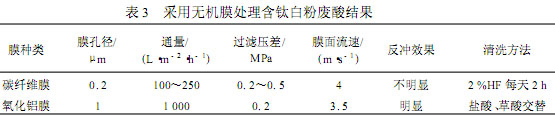 在硫(liu)酸法(fa)生產(chan)鈦白粉的(de)(de)過程中(zhong),產(chan)生大量的(de)(de)廢(fei)酸液,其中(zhong)含有偏鈦酸細(xi)(xi)微顆(ke)粒。傳(chuan)統的(de)(de)沉降方(fang)法(fa)不僅占(zhan)地面積大,而且(qie)回收不完全,限制了(le)廢(fei)酸的(de)(de)回收利用(yong),并污染環境。Bauer等研究了(le)采用(yong)碳(tan)纖維膜(mo)處(chu)理硫(liu)酸法(fa)生產(chan)二(er)氧(yang)化鈦中(zhong)產(chan)生的(de)(de)含二(er)氧(yang)化鈦細(xi)(xi)顆(ke)粒廢(fei)酸,其結(jie)果見表3。李紅(hong)、鐘景等采用(yong)氧(yang)化鋁陶(tao)瓷微濾(lv)膜(mo)處(chu)理類(lei)似的(de)(de)廢(fei)酸,取得了(le)較好(hao)的(de)(de)結(jie)果(見表3)。