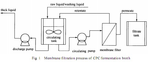 CPC是水溶性化合物,其游離酸相對分子質量為415.44。產CPC的菌體為頂頭孢霉菌(Ceph2alosporiumacremonium),菌體大小通常在1~10μm之間,是發酵液中主要的固形物。此外,發酵液中還往往帶有未被菌體吸收的乳化油粒和少量未分解完全的固形顆粒。通常發酵液濕固含量在35%(mass)左右,干固含量在10%(mass)左右。在滿足下游工序對濾液質量要求的情況下,選擇合適的濾膜,可以獲得大的膜通量,并使膜在對固形物有效截留的同時對CPC基本沒有截留作用。因此可以假定膜兩側的CPC濃度相同,即膜對菌絲體等固形物的透過率為0,而對CPC的透過率為100%。循環罐在攪拌情況下可以認為是一個全混釜。