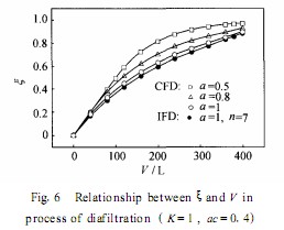 由于在洗濾階段CFD操作模式比IFD操作模式具有更好的濃度梯度,因此在前濃縮比a、后濃縮比c及頂洗劑加入量相同情況下,前者的收率要比后者高。但由于洗濾階段保留液中固形物含量總是處于較高濃度,因此當體積增長率K一定時,CFD操作模式下的膜平均通量要低于IFD操作模式下的膜平均通量。