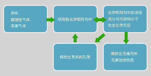 菊恩的化學吸附劑呈紫紅色小球狀或黑色柱狀顆粒, 是一種可以持續凈化工業和商業環境中產生的腐蝕性、惡臭、及有毒氣體的空氣過濾介質。與傳統的空氣吸附劑單純物理吸附不同的是,菊恩的化學凈化吸附劑通過物理吸附與化學氧化吸收相結合,物理吸附僅僅作為的一種手段來收集空氣中的污染物,而吸附劑中的活性成分不斷的同收集來的污染物分子產生化學反應,“吃掉 ”污染物,從而徹底清除掉空氣中的污染物。因為其顆粒獨特結構決定了這種化學氧化過程不會有高溫或燃燒等現象發生,具有持續、穩定、高效、即使在低溫或飽和的狀態下也不可逆的優點。因此,整個系統獨一無二。