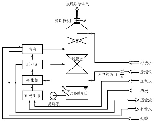 優(you)秀的設備還需配上合(he)理的工藝,才能達(da)到既提(ti)高(gao)脫硫效率又降低運行費用的效果(guo),滿(man)足技(ji)術(shu)經濟最優(you)的原則。就目(mu)前來(lai)說,濕(shi)法(fa)脫硫技(ji)術(shu)應用廣(guang)泛,占有全世(shi)界FGD裝(zhuang)置總量的85%以(yi)上。下圖為雙堿法(fa)(濕(shi)法(fa))的典型工藝圖。