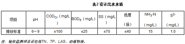 設計出水水質:達到《紡織染整工業水污染物排放標準》(GB4287-1992)表3一級標準,主要指標見表2。